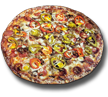 Red Sauce Base with Our In-House Sausage, Onions, Crisp Pepperoni and Banana Peppers then topped with Mozarella Cheese.